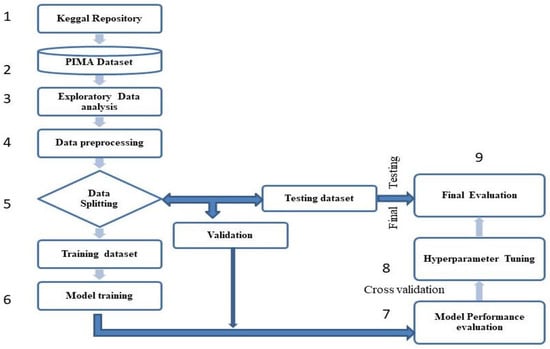 The ‘outcome’ is the dependent or target variable, while the other eight attributes were independent variables. The ‘outcome’ variable for diabetes was a binary number, where 0 denotes no diabetic and 1 suggests diabetic. In this study, the accuracy of predicting a patient’s diabetes status in female patients was improved by utilizing data mining and ML algorithms. The methodology used in this work is depicted in Figure 2.