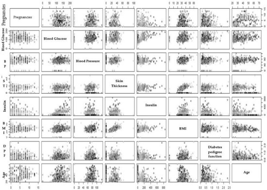 In our dataset, we found a strong positive correlation between BMI and skin thickness, insulin, and blood glucose, while age does not have a positive correlation with the number of pregnancies, as can be seen in Figure 5. Other factors do not have a positive or negative correlation with each other, dots are scattered throughout the scattered plot. These relationships also verify the results obtained in [32]; similar results were obtained in heatmap analysis in our study.