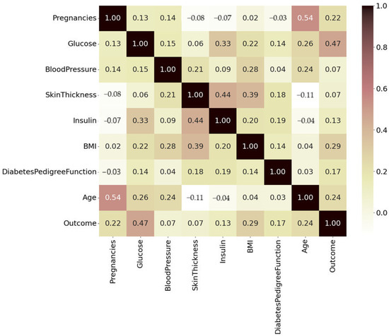 In this work, the Pima Indian diabetes dataset (PID) was retrieved from the Kaggle ML Repository (https://www.kaggle.com, access on 19 October 2023) [19]. All the patients enrolled in this study were adult women who had reached the age of 21 and above. A brief overview of the dataset’s features is represented in Table 1, which includes data about 768 patients who took part in the clinical investigation, eight different parameters Pregnancies, blood glucose, blood pressure, skin thickness, insulin, body mass index (BMI) diabetes pedigree function (DPF), and age was taken, and the outcome was selected as the target.