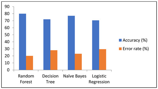 The results from all the developed models for predicting diabetes are shown in Table 8. The findings indicate that RF achieved the highest accuracy of 80%, as compared to NB of 77%, DT 72%, and LR had the lowest accuracy of 70.5%. Additionally, RF had the lowest error rate of 20% as compared to other developed models; similarly, RF also demonstrated better performance compared to the other models Table 10.