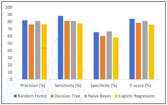 A comparison of the entire developed model in terms of Precision, Sensitivity, specificity, and F-score is shown in Figure 8. The RF model has the best precision as compared to other models; DT and LR have almost similar precision. Overall, by looking at all the parameters: sensitivity, specificity, and F-score, it can be seen that RF gives the best results.