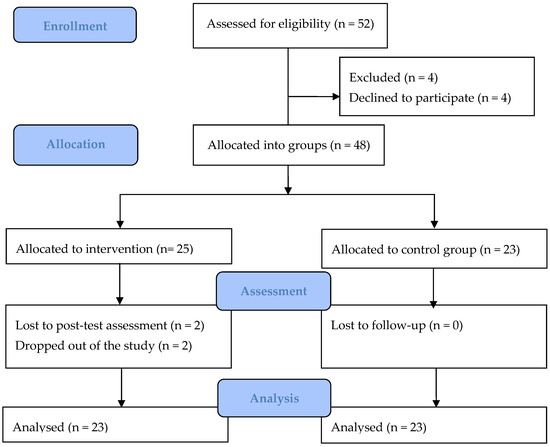 Fifty-two children and/or adolescents with cystic fibrosis were eligible and were referred to participate in the study, 48 of whom agreed to take part. Two participants allocated to the intervention group dropped out of the study and did not complete the intervention. Based on a per-protocol approach, 46 participants were included in the final analysis (23 participants in each group; see Figure 1). The participation rate in the study was 92.3% and the dropout rate was 4.3%. No adverse events were reported.