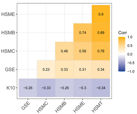 The correlation among K10 score, general self-efficacy, and health self-management (p < 0.01). Abbreviations: K10, K10 score; GSE, General self-efficacy; HSMC, Health self-management cognition; HSME, Health self-management environment; HSMB, Health self-management behavior; HSMT, Health self-management total scores.