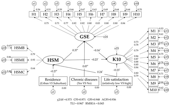 The standardized structural equation model of health self-management on K10 score with general self-efficacy as a mediator. Abbreviations: K10: K10 score; GSE: General self-efficacy; HSMC: Health self-management cognition; HSME: Health self-management environment; HSMB: Health self-management behavior; HSM: Health self-management; H: General self-efficacy item; M: K10 score item. * p < 0.01.