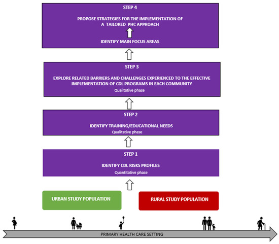 A convergent mixed-method design was used. The quantitative phase described CDL risk profiles in urban and rural populations in the FS [16], and qualitative focus group discussions explored participants’ knowledge of CDLs, including patients, PHC team members, and medical students, and their experiences with implementing CDL programs.