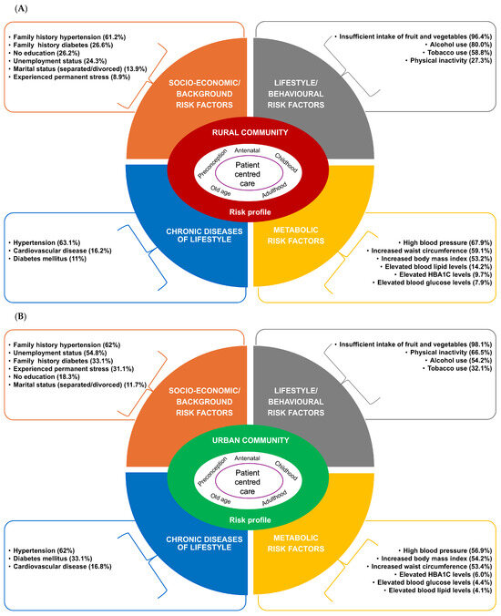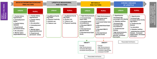 Step 1 of the framework development comprised constructing the CDL risk assessment profiles for the urban and rural study populations. Risk assessments allow the identification of several risk factors that deserve attention [23]. The prevalence of different socio-behavioural-metabolic risk factors associated with CDLs was summarised and prioritised to construct the CDL risk profiles for rural and urban study populations (Figure 2 and Figure 3).