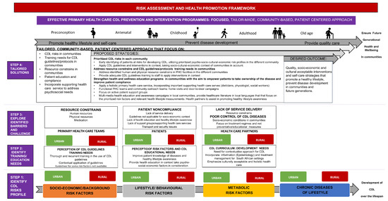 Current intervention strategies include integrated chronic care and management approaches guided by the WHO’s framework for preventing and controlling chronic diseases [13,14]. Despite the widespread adoption of integrated chronic care services at the primary care level in sub-Saharan Africa (SSA), several limiting factors still exist, including staff shortage and workload, physical resource constraints (especially in rural areas), and inadequate supply of medicine [13]. The WHO’s Innovative Care for Chronic Conditions (ICCC) Framework [15] emphasises evidence-based, cost-effective interventions to promote integrated, patient-centred care. Given South Africa’s escalating CDL burden, aligning these strategies with health system planning is crucial. This study aimed to develop a risk assessment and health promotion framework to strengthen existing efforts to prevent and control CDLs in rural and urban communities in the FS province.