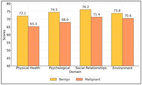 On the WHOQOL-BREF, the physical health scores were significantly lower in the malignant group (65.3 ± 15.5) compared to the benign group (72.1 ± 14.2, p = 0.009), indicating that malignant patients perceive their physical health more negatively. The physical health domain assesses pain, energy, sleep, mobility, and daily activities. The psychological domain was also significantly lower in malignant patients (68.0 ± 14.6) than benign patients (74.5 ± 13.8, p = 0.006), reflecting issues with body image, negative feelings, self-esteem, and cognition. These findings suggest that malignant patients experience greater psychological distress. Social relationships scores were lower in the malignant group (71.4 ± 15.7) compared to the benign group (76.2 ± 15.0), but the difference was not statistically significant (p = 0.078). The environment domain showed no significant difference between groups, as presented in Figure 1.