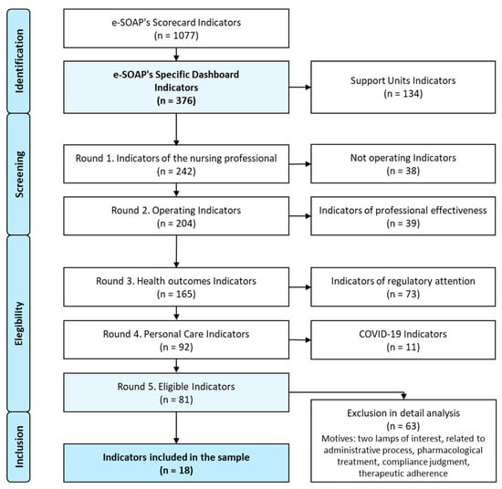 Phase II Eligibility. This phase aims to identify the objectives specific to the purpose of the study, so three rounds of exclusion are applied. Round 3: Exclude indicators on the efficiency of the professional’s activity that do not report on the health outcomes of the person but report on health activity processes. For example, implementation of care plans, follow-up control of patients with a specific chronic disease. Round 4: Exclude indicators linked to processes regulated by regulations that have an obligation of equal care for all persons and, therefore, do not allow discriminating the person’s level of care. For example, follow-up of polymedicated program, vaccination schedule. Round 5: Exclude indicators associated with the COVID-19 process that arise specifically ad hoc during the pandemic because they have shown changes in the definition of the indicator, as well as in the ability to identify the actual population data assigned to the referring nurse professional, because individuals were cared for in centralized resources or at their place of work.