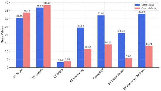 Patients with rCOM exhibited significant anatomical variations in the Eustachian tube compared to the control group, particularly in the angle, length, width, and presence of obstructions and abnormalities in positioning (Table 2 and Figure 1).