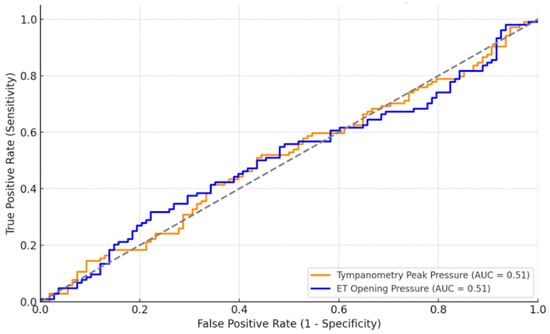 An AUC value of 0.5 indicates no better predictive ability than random chance, and the values observed here are close to this threshold. While tympanometry peak pressure and ET opening pressure are relevant for assessing Eustachian tube dysfunction, their ability to discriminate between patients with and without COM recurrence based on this analysis appears limited. Further investigation with additional or alternative functional markers may be required to better predict COM recurrence.