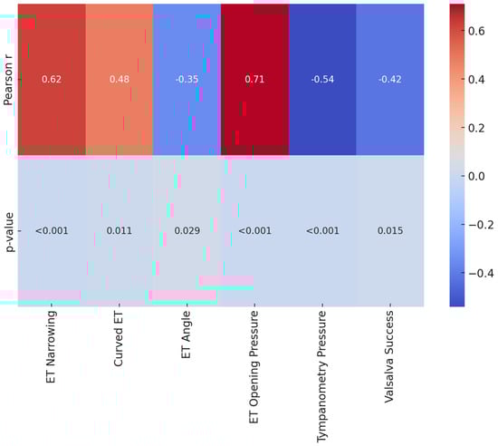 Increased ET narrowing, higher ET opening pressure, and more negative tympanometry peak pressure were associated with higher odds of COM recurrence, while a successful Valsalva maneuver and wider ET angles were linked to lower recurrence odds. Pearson correlations ranged from moderate to strong, with p-values < 0.05 across all variables, indicating that both anatomical and functional impairments significantly predict COM recurrence.