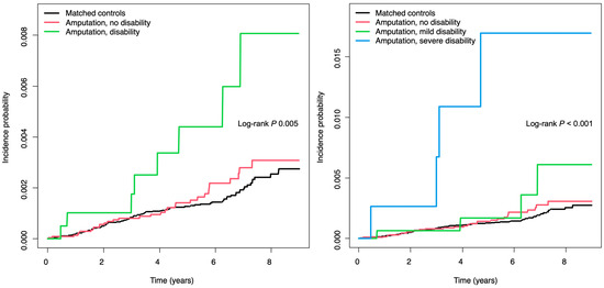 To consider the effect of disability, the disability grade registered in the National Disability Registry (NDR) of the Ministry of Health and Welfare was used. In Korea, people with disability are registered to obtain social benefits from the government. To diagnose a disability of the extremities due to amputation, physical examinations and X-ray tests are required [15]. Disability grades are determined based on the disability severity, ranging from 1 being the most severe to 6 being the mildest. In general, the amputation of proximal sites is a severe level of disability (Tables S1 and S2). For example, patients with grade 1 amputation have both arms amputated above the wrist joint (upper extremities) or both legs above the knee joint (lower extremities), and subjects with grade 6 amputation have one phalange amputated above the interphalangeal joint (upper extremities) or one phalange below the tarsometatarsal joint (lower extremities) [15]. In this study, patients who were registered in the NDR within 1 year after the index date were classified into the disability group and further divided into mild (grades 4–6) and severe (grades 1–3) disability groups. In addition, the levels of amputation were grouped as upper limb (above the elbow, between the elbow and wrist, and below the wrist) and lower limb (above the knee, between the knee and ankle, below the ankle).
