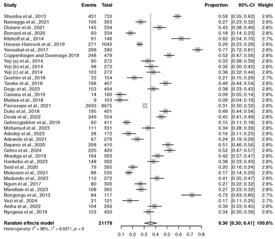 Thirty-four cross-sectional studies, with a sample size of 21,178, found that PLWHIV on ART displayed an increased risk of depression [,,,,,,,,,,,,,,,,,,,,,,,,,,,,,,,,,]. The lowest prevalence was 9%, and the highest prevalence was 77% [,]. However, the overall prevalence from the random meta-analysis was 36% (95% CI (30%, 41%)), p < 0.01. The findings revealed a high level of heterogeneity (I2 of 98%), as shown in Figure 2.