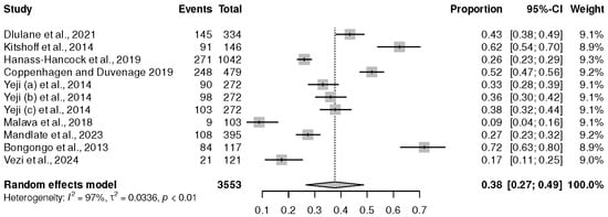 Nine studies [,,,,,,,,], with eleven arms, were conducted in Southern Africa. These cross-sectional studies had a sample size of 3553 PLWHIV on ART, and they showed a prevalence of 38% (95% CI (27%, 49%), p ˂ 0.01) and I2 = 97%, as shown in Figure 3.