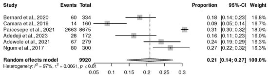 Only six cross-sectional studies conducted in Western Africa [,,,,,] explored the risk of depression among 9920 PLWHIV on ART. The result of the random effect meta-analysis reported the prevalence of depression at 21% (95% CI (14%, 27%), p ˂ 0.01), and I2 = 97%, as shown in Figure 4.