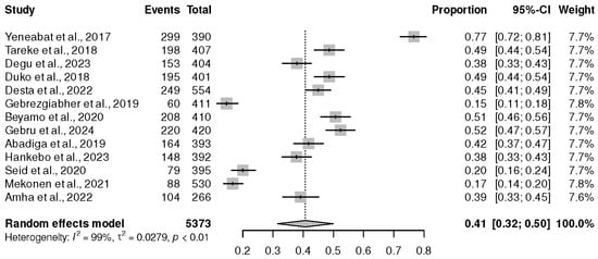 Prevalence of depression in studies published in Northern Africa. Yeneabat et al., 2017 [], Tareke et al., 2018 [], Degu et al., 2023 [], Duko et al., 2018 [], Desta et al., 2022 [], Gebrezgiabher et al., 2019 [], Beyamo et al., 2020 [], Gebru [], Abadiga et al., 2019 [], Hankebo et al., 2023 [], Seid et al., 2020 [], Mekonen et al., 2021 [], and Amha et al., 2022 [].