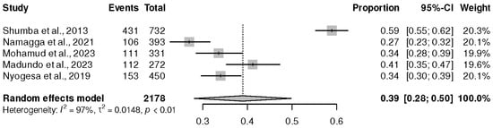 The last region in Africa, in this case, Eastern Africa, had only six studies [,,,,,], with the lowest sample size (2332 PLWHIV on ART). However, the results from the meta-analysis revealed a prevalence of depression at 39% (95% CI (28%, 50%), p ˂ 0.01), and I2 = 97%, as shown in Figure 6.