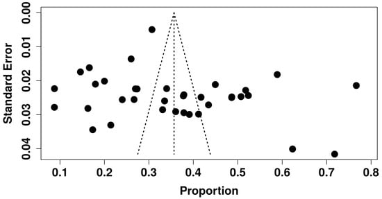 A data extraction form was used by the two reviewers (D.M.M. and W.N.P.) to extract data from the studies. The data extracted in each study included author, date or year of publication, study title, study design, age, gender of the PLWHIV, sample size, country, and ART. The third reviewer (K.M.) assisted the reviewers (D.M. and W.P.) in reaching a consensus regarding any disagreements. The data were analysed using an online meta-analysis tool, i.e., https://metaanalysisonline.com/ (accessed on 5 November 2024), and Jamovi software (version 2.4.8.0). The number of PLWHIV that developed depression and the sample size were extracted in each cross-sectional study. Data were reported as prevalence and 95% confidence intervals. Meta-regression and subgroup analysis were conducted to investigate the source of heterogeneity. A funnel plot was graphically used to illustrate the presence or absence of publication bias. In contrast, the Egger regression test was used to statistically substantiate bias.