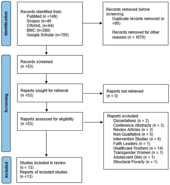J.B. independently screened the 53 remaining titles and abstracts. When relevancy was unclear, the full text of the article was obtained and further reviewed. Several studies were excluded because their titles and abstracts did not clearly indicate their relevance to the focus on Black cisgender women and PrEP uptake. These included studies on healthcare workers, dissertations, conference abstracts, review articles, and other topics outside the scope of this review. We have clarified these exclusions to ensure transparency in the selection process. J.B. then collaborated with C.M.V to create a structured charting table that included study information, population of interest, sample size, study methodology, applied theories, and findings. Based on this table, J.B. made the final selection of 13 articles, and C.M.V. confirmed this decision.
