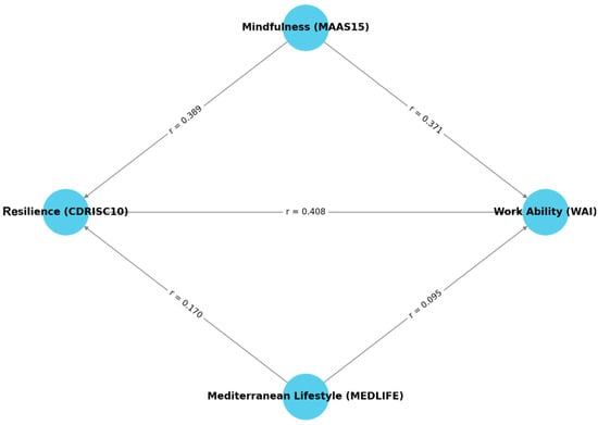 These findings underscore the synergistic interaction among mindfulness, resilience, and adherence to the Mediterranean lifestyle in fostering work ability. While mindfulness and resilience exhibit particularly strong connections to work outcomes, the Mediterranean lifestyle provides an additional, albeit less impactful, contribution. From a practical perspective, these results suggest that corporate wellness programs focusing on enhancing mindfulness and resilience could yield substantial improvements in employee work ability. While adherence to the Mediterranean lifestyle plays a supportive role, it may be less immediately impactful for workplace interventions. Unexpectedly, the Mediterranean lifestyle did not show a significant correlation with mindfulness. This finding may indicate that lifestyle adherence alone does not necessarily enhance the cognitive or emotional traits associated with mindfulness.