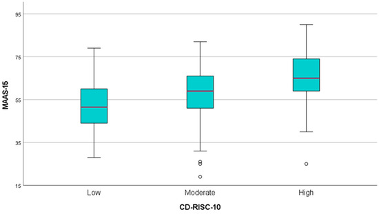 A boxplot analysis was conducted to evaluate the relationship between resilience, as measured by the CD-RISC-10, and mindfulness, as assessed by the MAAS-15 scale (Figure 5). Participants were categorized into low, moderate, and high resilience groups based on their CD-RISC-10 scores. The results indicate a clear positive trend between resilience and mindfulness. Participants in the low resilience group had lower median MAAS-15 scores compared to those in the moderate and high resilience groups. Specifically, the interquartile range (IQR) for mindfulness scores was narrowest for the low resilience group, suggesting less variability in mindfulness among participants with low resilience. The moderate resilience group demonstrated higher median mindfulness scores and a slightly wider IQR, indicating a broader range of mindfulness levels in this group. The high resilience group exhibited the highest median mindfulness scores, with an even greater spread of values compared to the other groups. Outliers were observed in both the moderate and high resilience groups, but these did not substantially affect the overall trend. These results were further verified by a one-way ANOVA analysis, which confirmed significant differences in mindfulness scores across the three resilience groups (p < 0.01). This finding strengthens the evidence that higher levels of resilience are associated with higher levels of mindfulness, highlighting a potential predictive relationship between these variables.