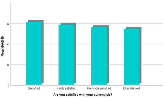 A one-way ANOVA was conducted to examine the relationship between mindfulness, as measured by the MAAS-15 scale, and job satisfaction, categorized into four groups: satisfied, fairly satisfied, fairly dissatisfied, and dissatisfied (Figure 6). The results showed a statistically significant difference in MAAS-15 scores across the four job satisfaction groups (F(3481) = 5.389, p = 0.001). This indicates that levels of mindfulness differ meaningfully depending on the degree of job satisfaction. Post hoc effect size analyses revealed that mindfulness explains 3.3% of the variance in job satisfaction (η2 = 0.033, 95% CI [0.006, 0.065]), which represents a small-to-moderate effect size. The epsilon-squared and omega-squared values (ε2 = 0.026, ω2 = 0.026) further confirmed the robustness of this finding, indicating that mindfulness accounts for approximately 2.6% of the variance in job satisfaction when adjusted for bias. These results suggest that higher levels of mindfulness, as reflected in the MAAS-15 scores, may be associated with higher levels of job satisfaction, emphasizing the potential role of mindfulness in fostering workplace well-being.