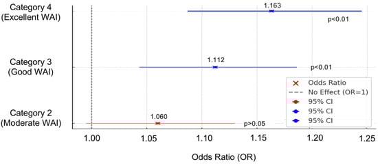 A multinomial logistic regression was conducted to examine the predictive role of mindfulness, measured by the MAAS-15 scale, in workplace well-being across different levels of the Work Ability Index, with category 1 being poor WAI, 2 moderate WAI, 3 good WAI, and 4 excellent WAI (Figure 7). The reference category for the analysis was poor working ability (category 1). Mindfulness was found to be a significant predictor of good and excellent working ability. For good working ability (category 3), mindfulness showed a significant positive association. The odds ratio was 1.112, with a 95 percent confidence interval of 1.043 to 1.186, and the p-value was 0.001. This indicates that for each one-unit increase in the MAAS15 score, the odds of having good working ability compared to poor working ability increased by approximately 11.2 percent. For excellent working ability (category 4), mindfulness demonstrated an even stronger predictive association. The odds ratio was 1.163, with a 95 percent confidence interval ranging from 1.087 to 1.245, and the p-value was less than 0.001. This suggests that a one-unit increase in the MAAS15 score was associated with a 16.3 percent increase in the odds of having excellent working ability compared to poor working ability. The significant intercept for excellent working ability (category 4) further highlights distinct differences in this group, reinforcing the predictive role of mindfulness in achieving higher levels of workplace well-being and productivity.
