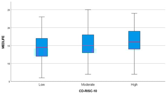 Psychological resilience, measured by the CD-RISC-10, showed a strong positive association with adherence to the Mediterranean lifestyle, as assessed by the MEDLIFE scale. A boxplot analysis revealed that participants with higher resilience had significantly greater adherence (Figure 8). The low resilience group displayed the lowest median MEDLIFE scores and minimal variability, as reflected by the narrowest interquartile range (IQR). The moderate resilience group exhibited higher median scores and a broader IQR, while the high resilience group demonstrated the highest median scores and the greatest variability. These findings were further validated by a one-way ANOVA, which confirmed significant differences in MEDLIFE scores across resilience levels (p < 0.01), emphasizing the robust relationship between resilience and the Mediterranean lifestyle.