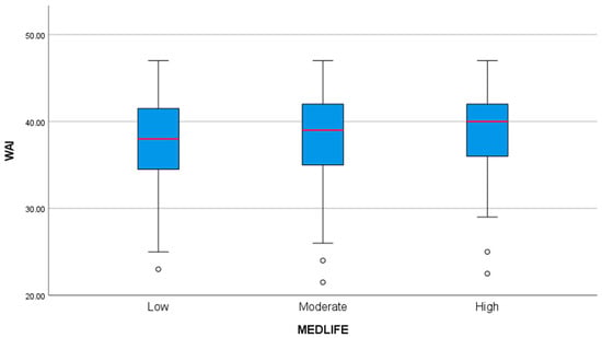A boxplot analysis was conducted to visualize the relationship between MEDLIFE adherence categories and the Work Ability Index (Figure 9). The analysis revealed a trend, with participants who demonstrated higher adherence to the Mediterranean lifestyle consistently reporting higher WAI scores. In order to explore further this trend, an ANOVA analysis was conducted to examine the relationship between adherence to the Mediterranean lifestyle (low, moderate, high) and the Work Ability Index. While the overall ANOVA result approached significance (F = 2.618, p = 0.074), small effect sizes, such as eta-squared (η2 = 0.011), indicated that 1.1% of the variance in work ability could be attributed to differences in Mediterranean lifestyle adherence. Post hoc LSD tests revealed that participants with high adherence (category 3) had significantly higher WAI scores compared to those with low adherence (category 1), with a mean difference of 1.398 (p = 0.024, 95% CI: 0.183 to 2.613). These findings suggest that higher adherence to the Mediterranean lifestyle may positively influence work ability, though the overall relationship is modest and warrants further investigation.
