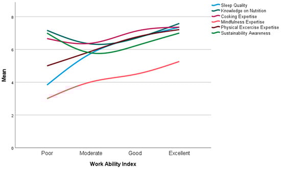 An ANOVA analysis examined the relationship between work ability and various wellness-related parameters (Figure 10). Significant differences were found in work ability across participants’ self-reported sleep quality (F = 12.506, p < 0.001), knowledge of human nutrition (F = 6.999, p < 0.001), expertise in meal preparation (F = 3.386, p = 0.018), mindfulness practices (F = 4.232, p = 0.006), physical exercise knowledge and experience (F = 7.959, p < 0.001), and awareness of the environmental impact of food production (F = 4.239, p = 0.006). Notably, the results for expertise in meal preparation, human nutrition, and sustainability followed a U-shaped distribution, indicating that both lower and higher levels of knowledge were associated with higher work ability, while moderate levels showed a weaker association. In contrast, expertise in mindfulness, physical exercise, and sleep quality exhibited a linear trend, with higher levels consistently correlating with greater work ability. These findings highlight the complex and varying influence of wellness factors on work ability.