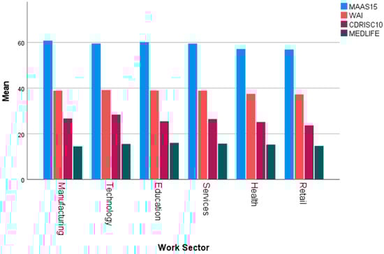 Means of Mindfulness, Work Ability, Resilience, and Mediterranean Lifestyle, across various work sectors.