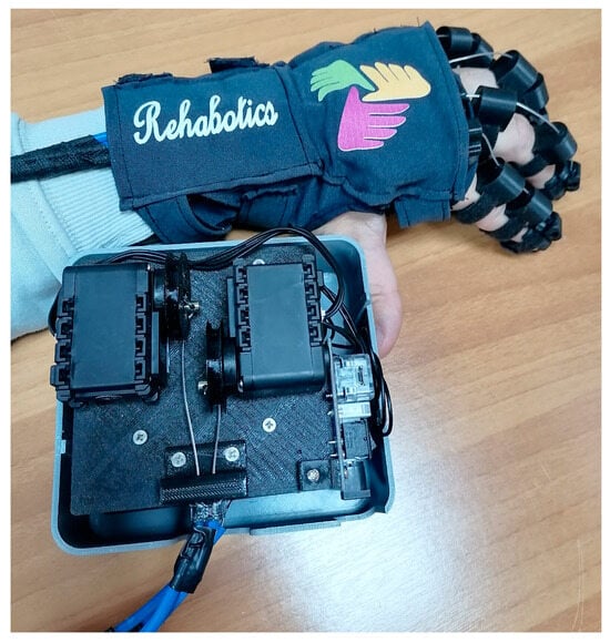 The role of the AEA is also crucial, as stretching training exercises represent a fundamental component of a comprehensive rehabilitation program [24]. The AEA has been developed as an appropriate application to fully manage finger movements through the rotational motion of servo motors (Dynamixel AX-12A, Corona, CA, USA). This device is characterized as an articulated structure comprising specially designed rings through which a wire is guided, responsible for transferring the kinetic energy of a servo motor to the finger structures (converting rotational motion into linear). These sections have a crescent shape for automatic alignment with the user’s finger. Each finger has three Velcro straps on its three bones, which can be adjusted to fit any finger size. To stabilize the exoskeletal aid on the patient’s hand, stabilizers have been adapted at two points. One point is the patient’s wrist, which can be adjusted to fit any wrist type through a structure (Figure 1).