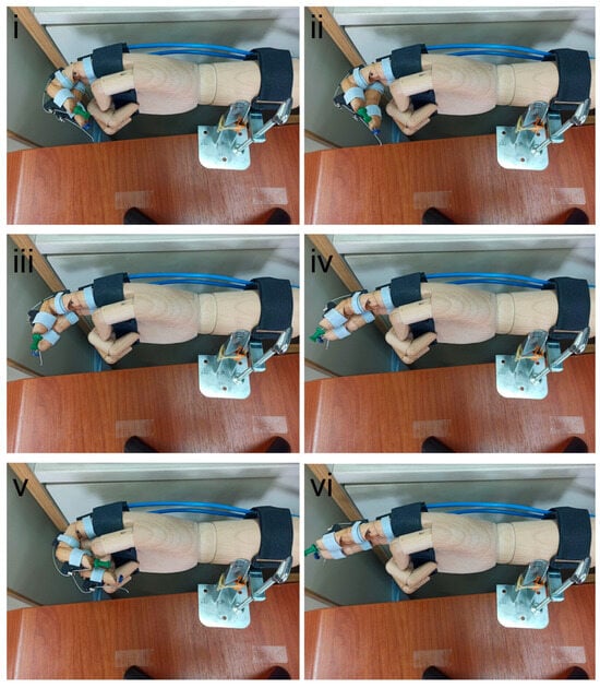 Finger (index and middle) movement. (i) Initial clenched hand position, (ii–iv) progressive stages of finger extension as the actuators gradually stretch the index and middle fingers, (v) return to the starting clenched position, and (vi) re-initiation of the extension cycle.