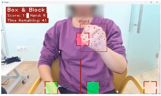 Hand detection and operation handling are powered by MediaPipe’s ML pipeline, which uses a palm detector and a hand landmark model to provide high-quality 2.5D landmarks. This setup allows real-time tracking using a low amount of resources. The software identifies hand poses and the different hand grips, calculating the distances between the fingers. The system calculates the position of the hand relative to the camera and ensures that the participant interacts realistically with the environment. The AR serious games platform integrates a collection of “Sollerman” games, such as Zip/Unzip Wallet, Key Lock, Open Jar, and Use Screwdriver and Draw, with some of these detailed in [33,35,36], and other games such as Balloon Pop and Rock-Paper-Scissors, along with the Box and Block test (BBT) [37]. A photo from AR BBT is presented in Figure 3.