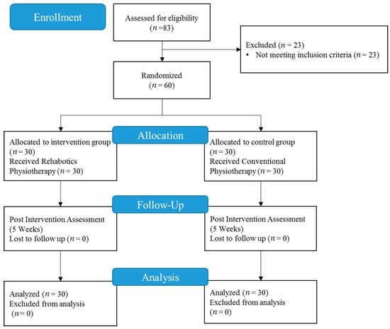 A total of 83 patients were screened; 23 individuals were excluded prior to randomization, and 60 were randomized. The pilot study included 60 post-stroke patients (Figure 5), with an average age of 70.97 ± 4.89 years. Participants were randomly assigned to either the intervention group (n = 30) or the control group (n = 30). The demographic characteristics of the participants are presented in Table 1, demonstrating the two groups in terms of age, gender, stroke side, post-stroke months, and AS baseline. The t-student tests showed no significant differences in terms of age (p = 0.53), AS (p = 0.85), BBT (p = 0.71), and stroke onset (p = 0.38). The distribution of patients according to the baseline AS is also shown in Table 1.