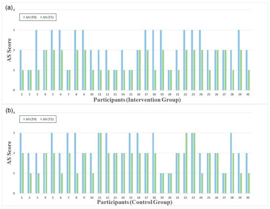 Additionally, as can be seen in Figure 6, in the intervention group, two participants with a baseline of AS = 3 improved by 2 points. Also, one participant from the control group experienced a similar change. Furthermore, 19 patients in the intervention group improved by 1 point, while the rest maintained their initial AS. On the other hand, in the control group, 15 patients improved by 1 point, while 1 (patient 22) revealed a higher AS score compared to T0.