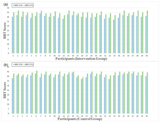 BBT score for participants in (a) intervention group and (b) control group at T0 (blue) and T1 (green).