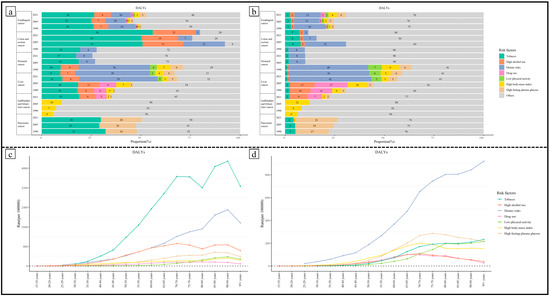(a) Age-standardized DALY rate attributed to various risk factors in 1990, 2005, and 2021 for males. (b) Age-standardized DALY rate attributed to various risk factors in 1990, 2005, and 2021 for females. (c) Age-standardized DALY rate attributed to various risk factors by age in 2021 for males. (d) Age-standardized DALY rate attributed to various risk factors by age in 2021 for females.