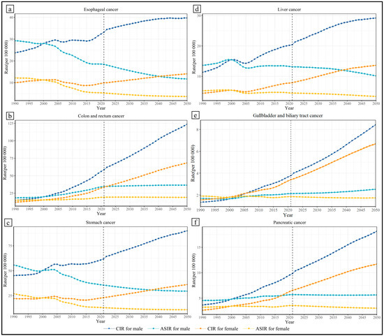 The following supporting information can be downloaded at https://www.mdpi.com/article/10.3390/healthcare13101096/s1: Figure S1: Predicted age-specific incidence rate of gastrointestinal cancers in 1990–2050. Figure S1a–l shows the prediction results of cancer burden for esophageal cancer, stomach cancer, colon and rectum cancer, liver cancer, gallbladder and biliary tract cancer, pancreatic cancer in males and females.