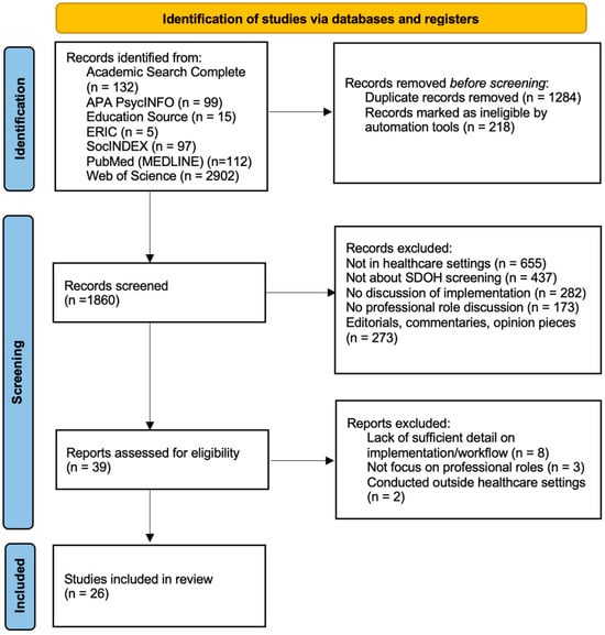 The review process involved systematic searchers across seven databases to capture relevant studies published between January 2000 to December 2024. These included Academic Search Complete, APA PsycINFO, Education Source, ERIC, and SocINDEX. Also included were the PubMed (MEDLINE) and Web of Science electronic databases. Search terms were carefully selected to capture the breadth and depth of literature related to SDOH screening tools, their implementation in healthcare settings, and the role of healthcare professionals. Search terms included [“Social determinants of health” OR SDOH OR “social needs” OR “health-related social needs” OR “social risk” OR “health-related social risk”] AND [“screening” OR “assessment” OR “tool”] AND [“role of social worker” OR “role of healthcare professional”]. A secondary search string included terms to focus on implementation and workflow: [“Social determinants of health” OR SDOH] OR [“social needs” OR “health-related social needs” OR “social risk” OR “health-related social risk”] AND [“screening” OR “assessment” OR “tool”] AND [implementation] AND [workflow].