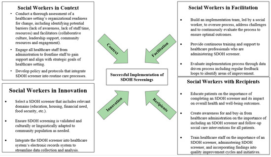 To improve the implementation of SDOH screenings, we turn to the field of implementation science, which focuses on methods and strategies to promote the adoption and integration of evidence-based interventions into healthcare. The i-PARIHS framework is suggested for implementing SDOH assessments and social care interventions in current healthcare settings. We recommend utilizing the expertise of social workers to develop better screening tools, practices, and more effective workflows.