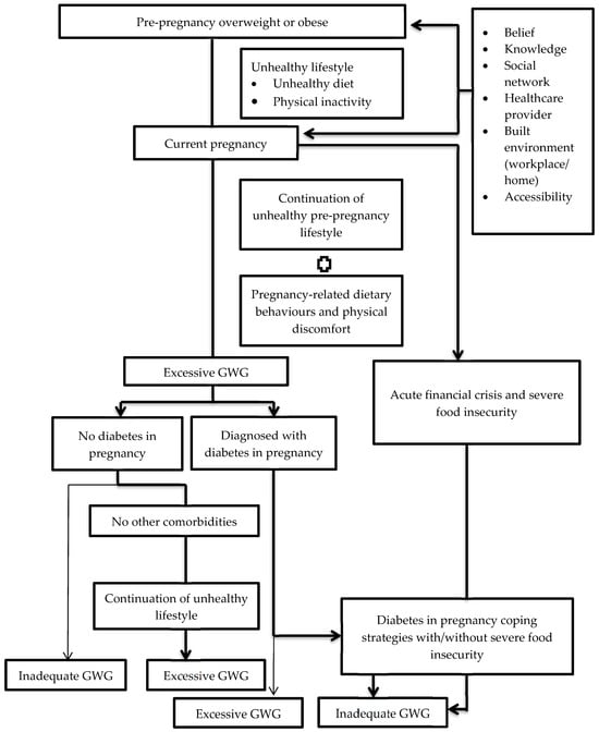 Although adequate GWG is important for favourable pregnancy outcomes, there is a paucity of data on the prevalence and modifiable risk factors of GWG, particularly in developing countries such as Malaysia. Most published studies focus on developed countries with distinct sociocultural contexts than developing countries, despite the fact that overnutrition is increasing while undernutrition persists in these countries [11,12]. A 2016 nationwide survey in Malaysia found that 14.6% of pregnant mothers were obese [13], and the prevalence was higher in hospital-based studies [14]. Moreover, most of the studies on GWG focused on the association between GWG and foetal and maternal outcomes, while existing local studies were limited to quantitative assessments of GWG predictors [15,16,17], and only one study examined the influence of socio-cultural norms and the environment on dietary nutrient intake and physical activity during pregnancy [18]. Farhana and colleagues found that inadequate GWG was prevalent among pregnant women in Kelantan, Malaysia, with low education, advanced maternal age, and pre-pregnancy overweight and obesity significantly associated with inadequate GWG [16]. However, the mechanism underlying the findings was unable to be determined due to the nature of the study. Additionally, nutrition during pregnancy is a critical determinant of maternal and foetal health, yet pregnant women are often influenced by conflicting narratives—including the cultural norm of “eating for two” and the reality of food insecurity, which limits access to nutritionally adequate food. These opposing forces can contribute to both excessive and inadequate GWG, complicating efforts to promote optimal maternal nutrition. Additionally, while suboptimal GWG is associated with poor maternal and foetal outcomes, food insecurity further compounds these risks and has been associated with adverse pregnancy outcomes, including maternal anemia, gestational diabetes mellitus (GDM), pre-eclampsia, preterm birth, intrauterine growth restriction (IUGR), and low birth weight. It is crucial to recognize that pregnancy represents a stage in a continuum of a woman’s health, where lifestyle choices made before, during, and after pregnancy collectively influence maternal and feotal outcomes. Thus, healthy living should extend beyond pregnancy and encompass the entire reproductive lifespan.