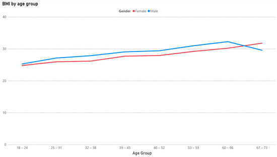 The result clearly shows that BMI tends to increase with age, in line with previous research [18]. With age, metabolism often slows down, making it easier to gain weight [18]. Hormonal changes, especially in women after menopause, can affect weight distribution and increase the risk of weight gain [19].