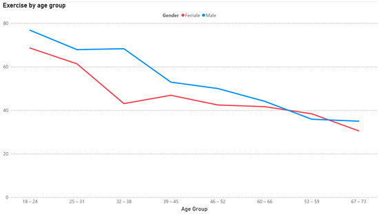 The influence of age on BMI and exercise was measured through an Analysis of Variance (ANOVA) and linear regression, with a significant coefficient indicating a trend from younger to higher age groups. We used Mann–Whitney tests to determine whether the genders had any significant differences.