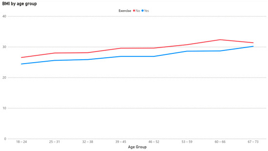 Exercise was associated with a lower BMI across most age groups, reflecting the expected effects of energy balance and an increased muscle mass [25,26,27]. The regression with interaction terms confirmed that both age and exercise independently influence BMI, but their interaction was not statistically significant in most cases. This indicates that the BMI-lowering effect of physical activity is relatively stable across age groups rather than being more or less pronounced with advancing age. The marginal effect observed in the 60–67 group (p = 0.07) may merit further investigation.
