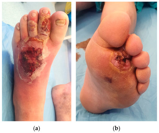 Appearance of the wound 25 days after broad-spectrum antibiotherapy, multiple surgical debridements, and negative-pressure wound therapy. (a) Dorsal aspect; (b) plantar aspect.