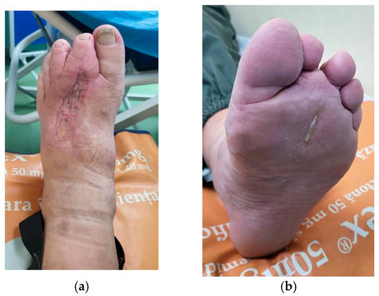 Local appearance of the wound 30 days after skin grafting and two sessions of injectable PRP, administered into the wound bed and surrounding tissue. (a) Dorsal view; (b) plantar view.