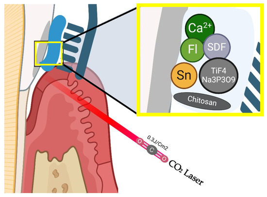 Fluoride (amine or sodium forms), tin (stannous fluoride/stannous chloride), calcium carbonate, and chitosan toothpastes, as well as bioactive glass-containing toothpastes, significantly reduce erosion and abrasion [69,109,110,111,112,113]. Sodium trimetaphosphate in fluoride varnish [114], rinsing with an iron solution [115], and carbon dioxide laser irradiation (0.3 J/cm2; 226 Hz) (Figure 4) [116] also mitigate erosion/abrasion.