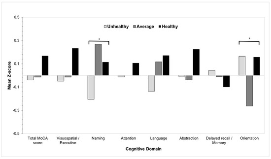 After adjusting for age, gender, educational level, income, BMI, diabetes, and heart diseases, results showed that the unhealthy group had significantly lower scores in the naming cognitive domain compared to the average and healthy groups (p = 0.01) (Table 2 and Figure 1). Participants in the average group scored significantly lower than those in the unhealthy and healthy groups in the orientation domain (p = 0.02). No significant associations were found between the three groups in the other cognitive domains (p > 0.05).
